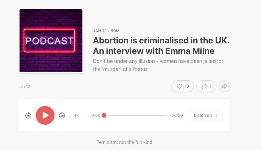 Early in January 2023, Julie Bindle and I met online to record an interview about my research for Julie’s substack site. During the interview we talked about the fact that abortion is still illegal in Britain, that vulnerable women are criminalisation for ending their own pregnancies, crisis pregnancies, the Infanticide Act, and what can be done to stop this injustice for women.